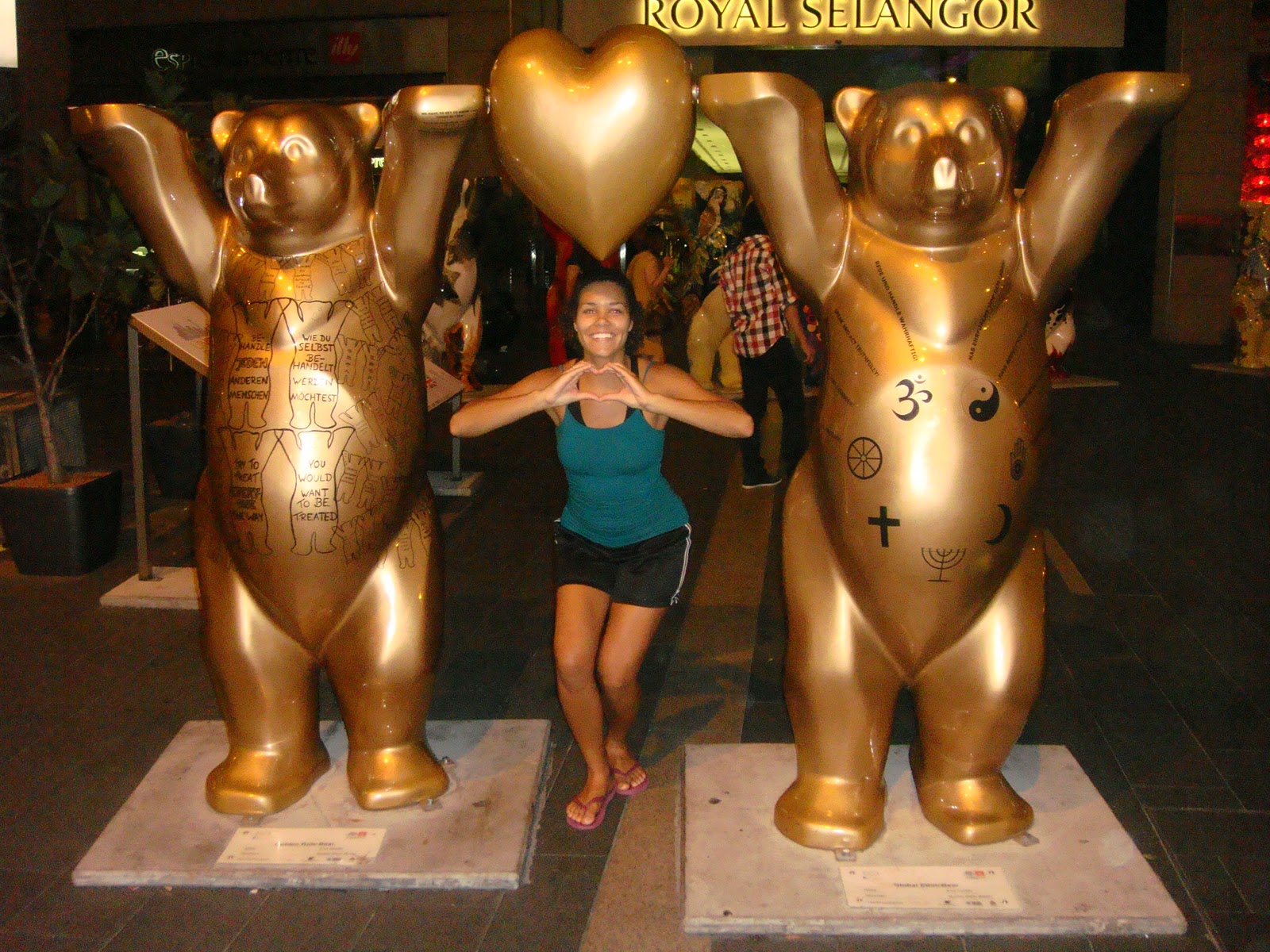 The United Buddy Bears are on exhibit in KL. Go to www.buddy-baer.com/united-buddy-bears to get an overview. Basically it is a world tour of 140+ bears each designed by a different country that promote World Peace. I took waaay more pictures than made sense, but here are some of them. Can you guess which country is represented without looking at the flag at our feet?